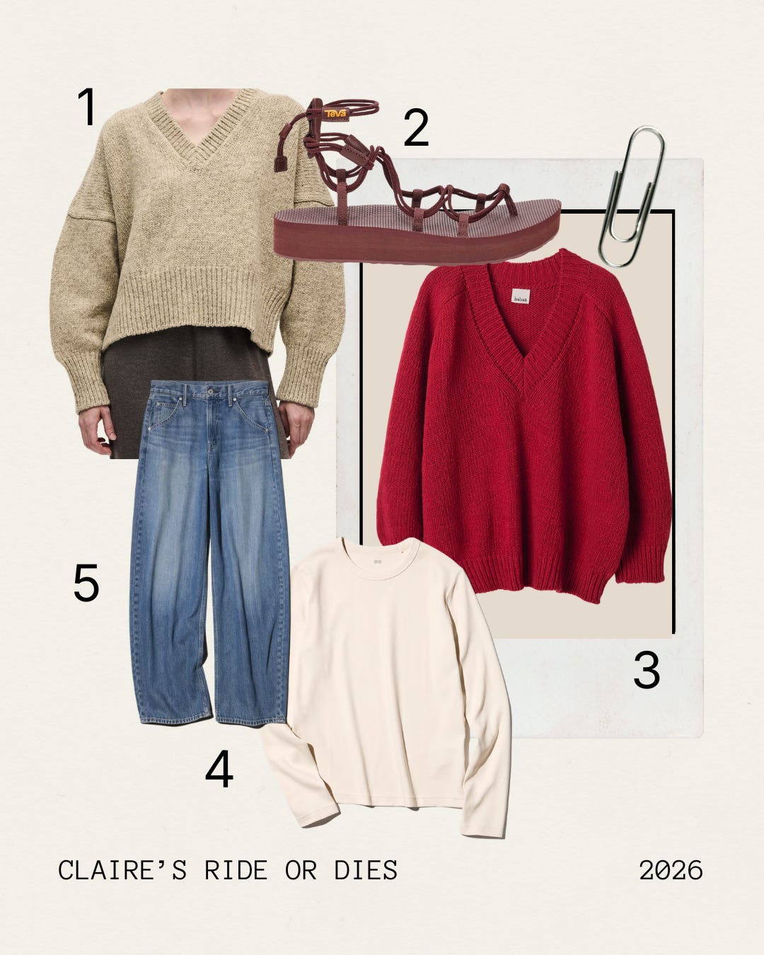 (1.) This wooly jumper thrown over everything when it’s cold or (3.) this cotton one when it’s warm. (2.) These sandals that won’t blister while chasing the runaway toddler on his scooter for kilometers. (4.) This soft cotton t-shirt that somehow works under or without a jumper. (5.) This pair of jeans that flatters, washes dreamily and with enough give in the waistband to excuse that midday Croque Monsieur.